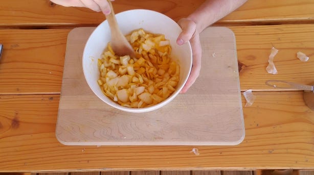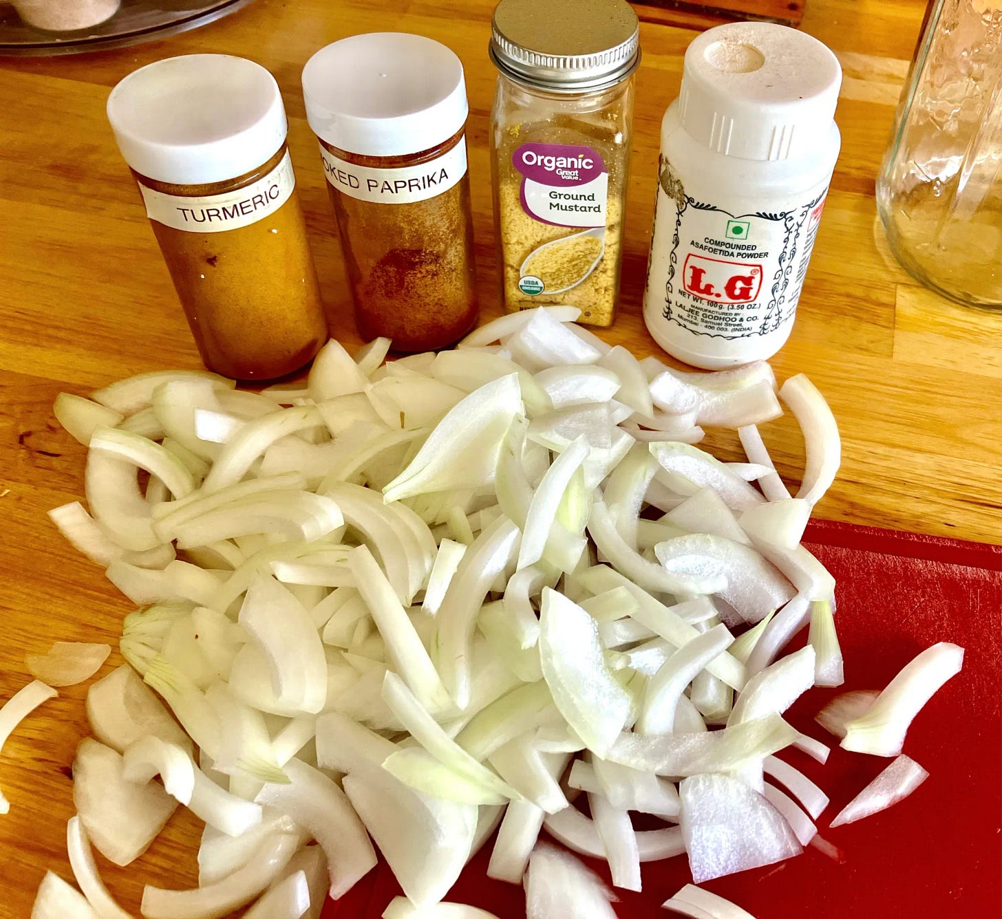 - 4 cups of thinly sliced onion, sliced pole to pole. See above